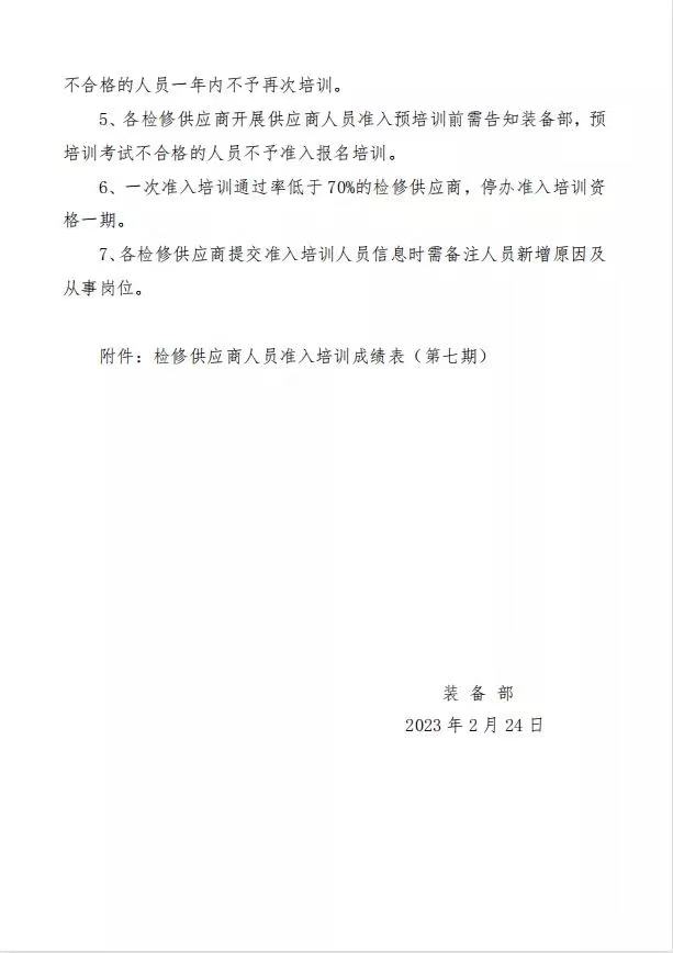 2023年2月23日裝備部組織開展第七期檢修供應(yīng)商人員準(zhǔn)入培訓(xùn)。武漢鼎業(yè)與其他單位共36人參加培訓(xùn)考試,其中31人培訓(xùn)考試合格,合格率為86.1%。